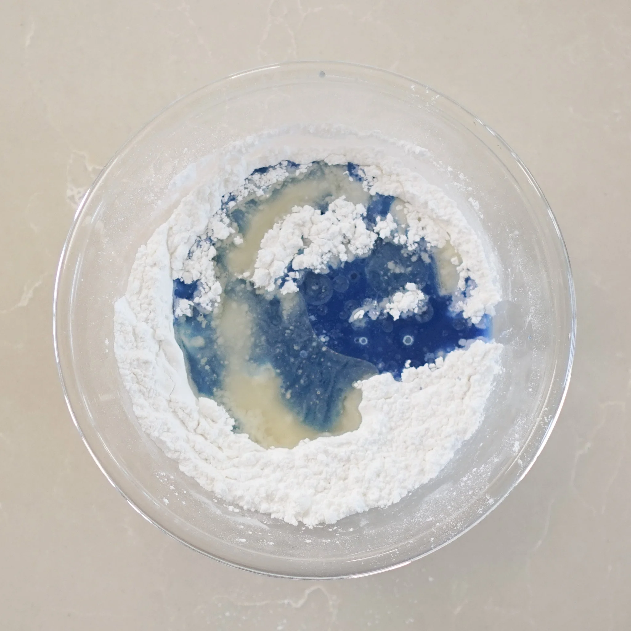 2. To make the batter for the snow skin, mix the glutinous rice flour, rice flour, wheat starch, and icing sugar together in a bowl.