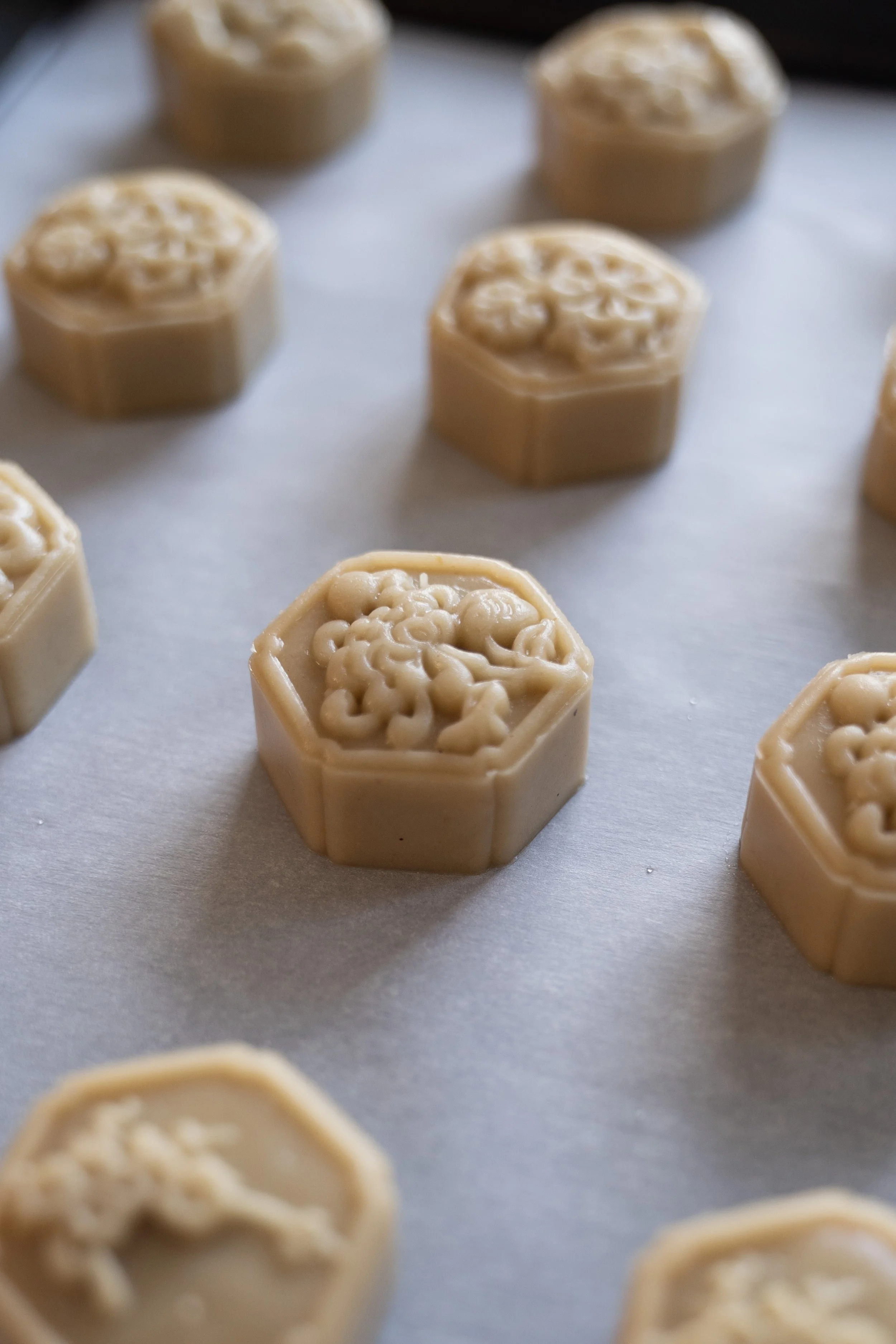 7. Shape using a mooncake mould on a baking tray lined with parchment paper. If the mooncake sticks, lightly dust the surface of the dough with flour before stamping.