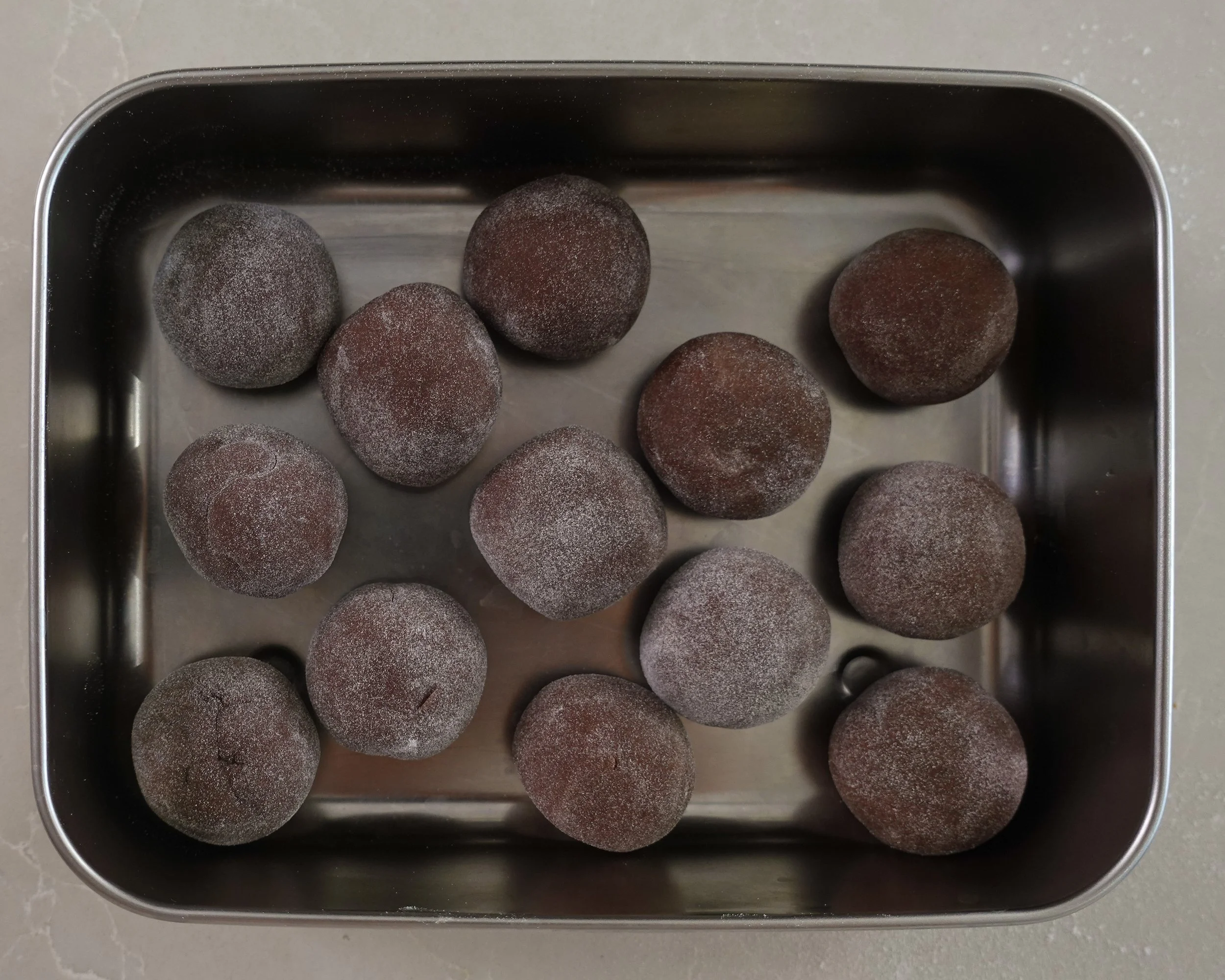 14. Once the snow skin is firm, portion into 25 g each. Dust in the cooked glutinous flour to prevent sticking.