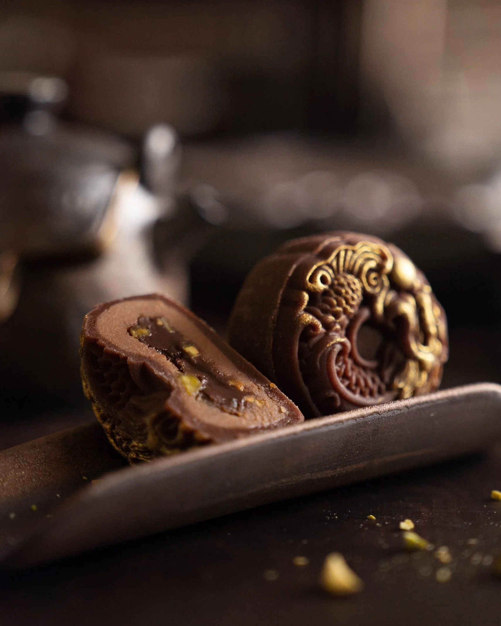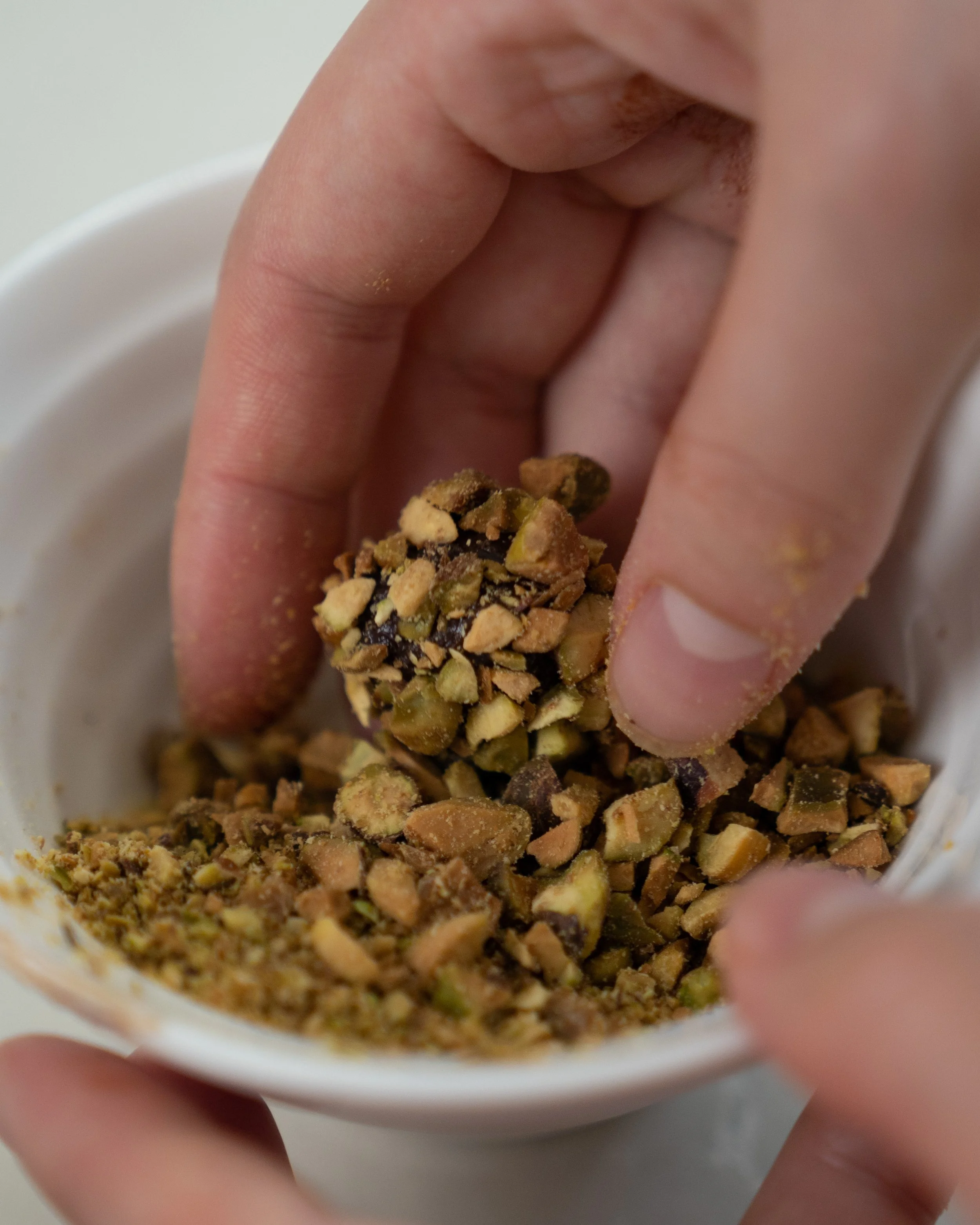 13. Portion the chocolate fudge center into 5 g each and roll in chopped roasted pistachios until fully coated. Keep in the freezer until needed.