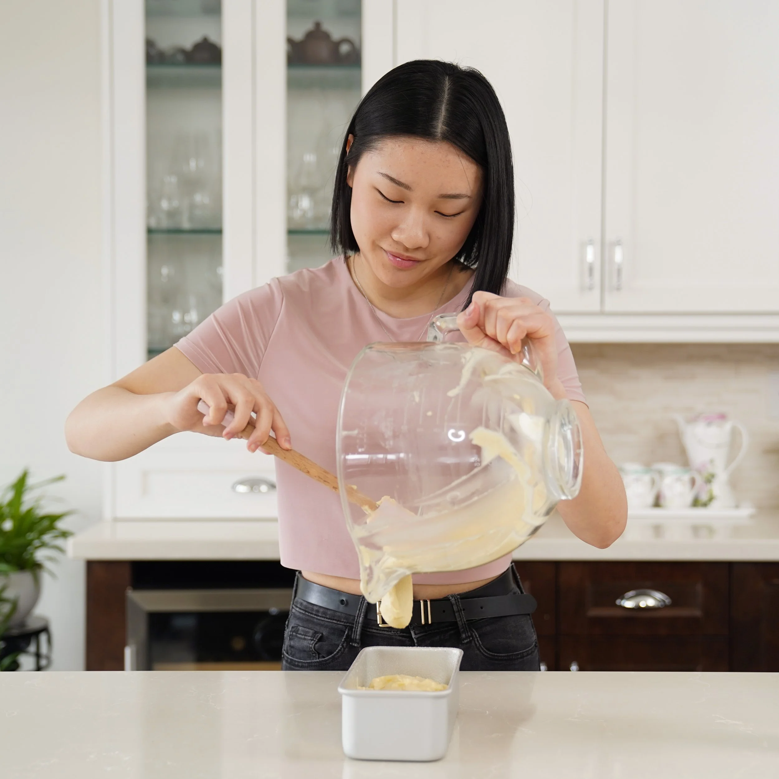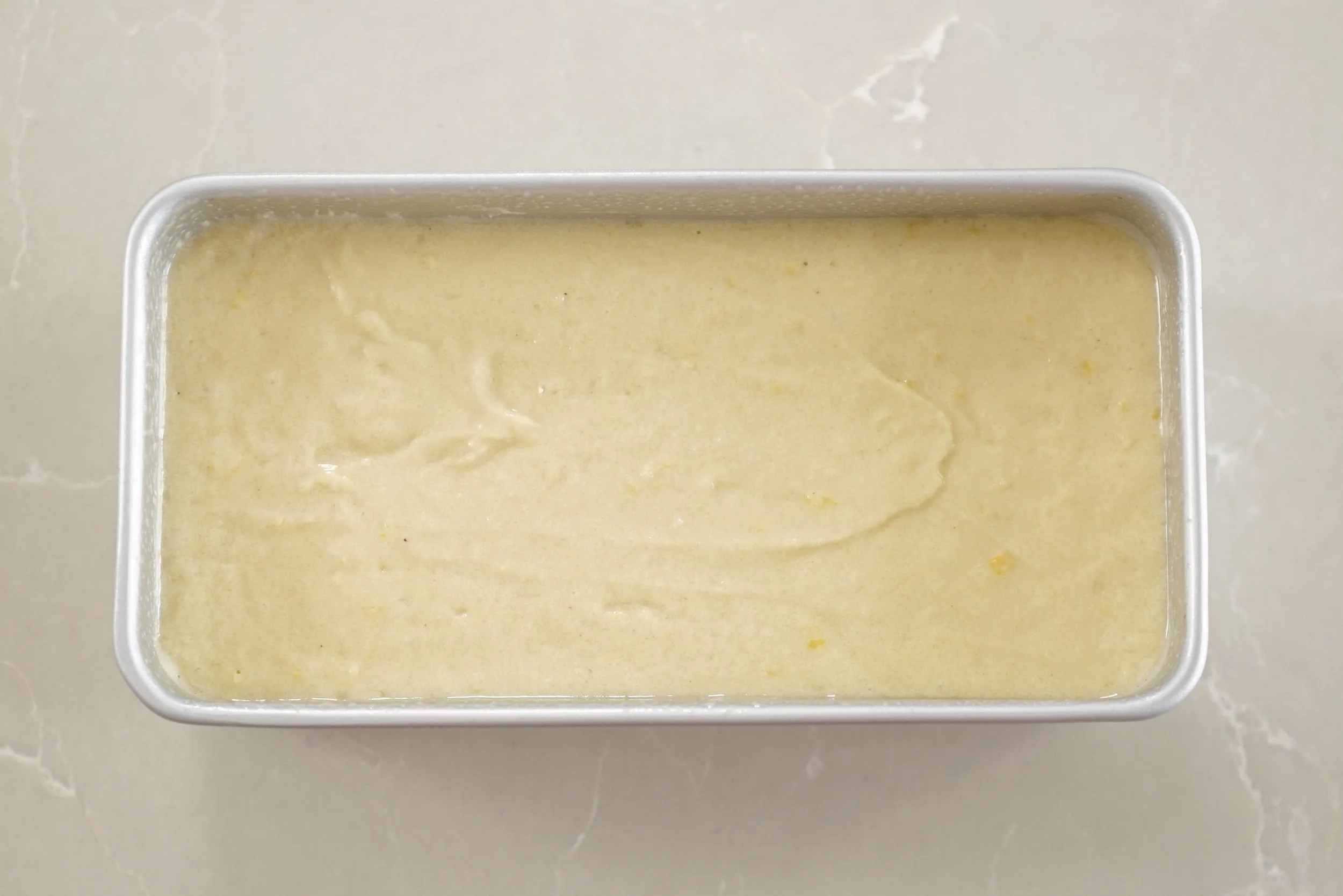 10. Transfer the batter into the prepared loaf pan and bake in your preheated oven at 350°F / 175°C for 40-45 mins, until a toothpick inserted into the centre of the cake comes out with no wet batter and minimal crumbs sticking.