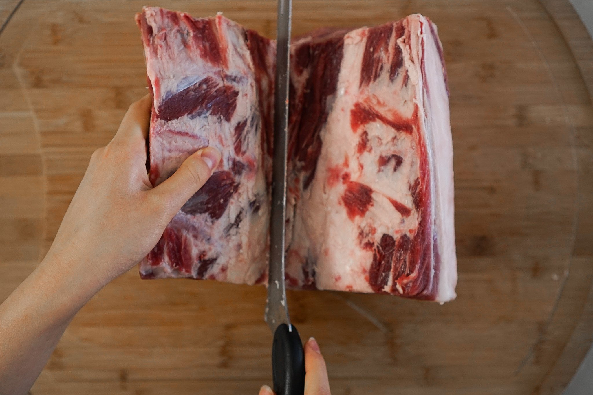 2. Cut between the ribs and the rest of the prime rib but not all the way, just separating it enough while still attached.