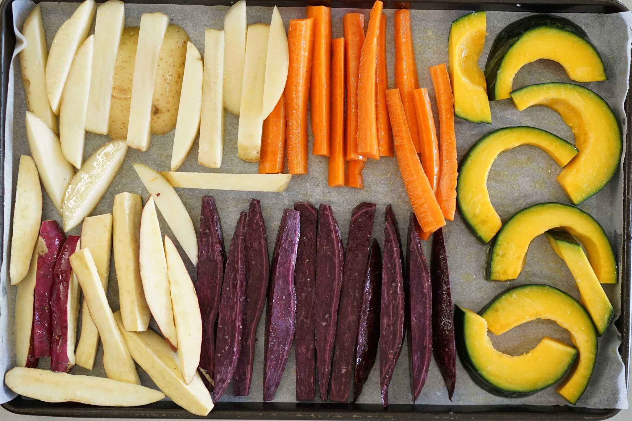 9. In the meantime, cut up some potatoes, carrots, purple sweet potatoes, sweet potatoes or squash and place them onto a lined baking tray.