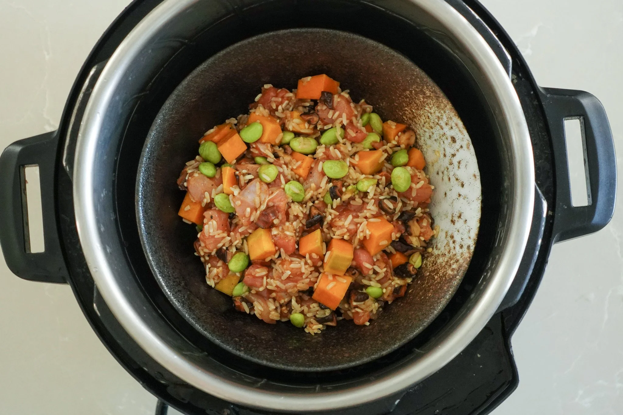 8. Fill an instant pot with some water and place it in a rack. Transfer the bowl into the instant pot and use the steam setting to cook the rice on high pressure for 15 minutes. Allow for natural release, the rice is ready to be enjoyed!