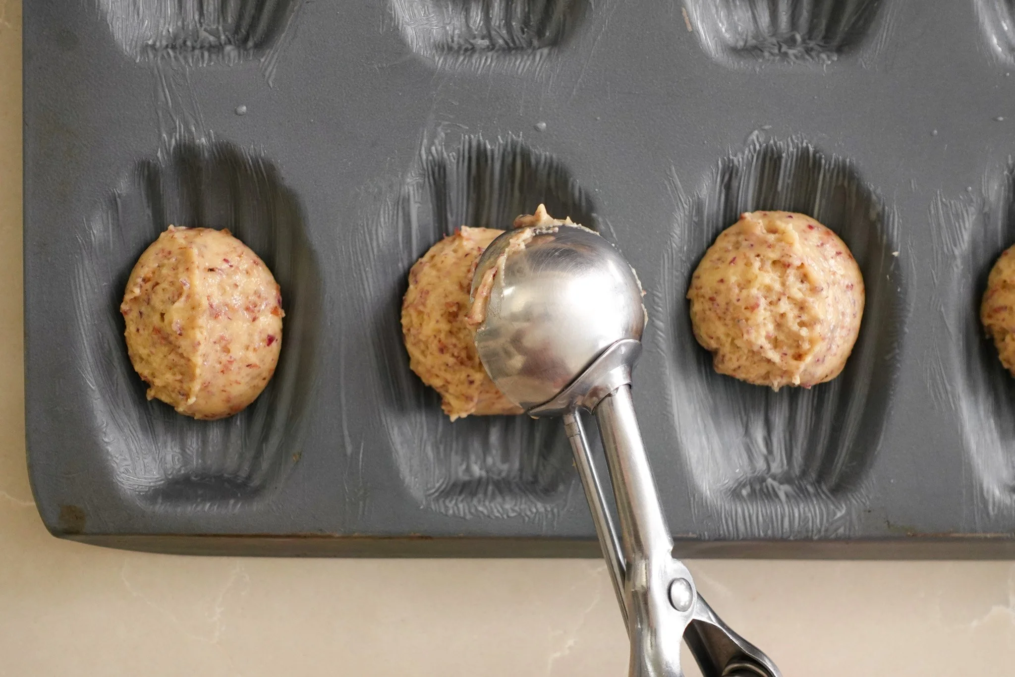 7. Scoop the cold batter into each mould using a mini ice cream scoop (mine holds about 1 tbsp).
