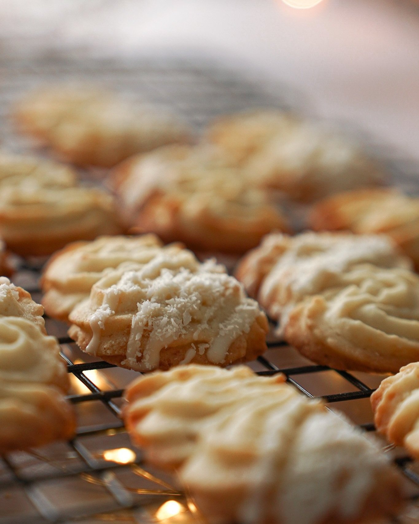 8. To decorate, drizzle some melted white chocolate onto the cooled cookies and top it off with some desiccated coconut before it sets.
