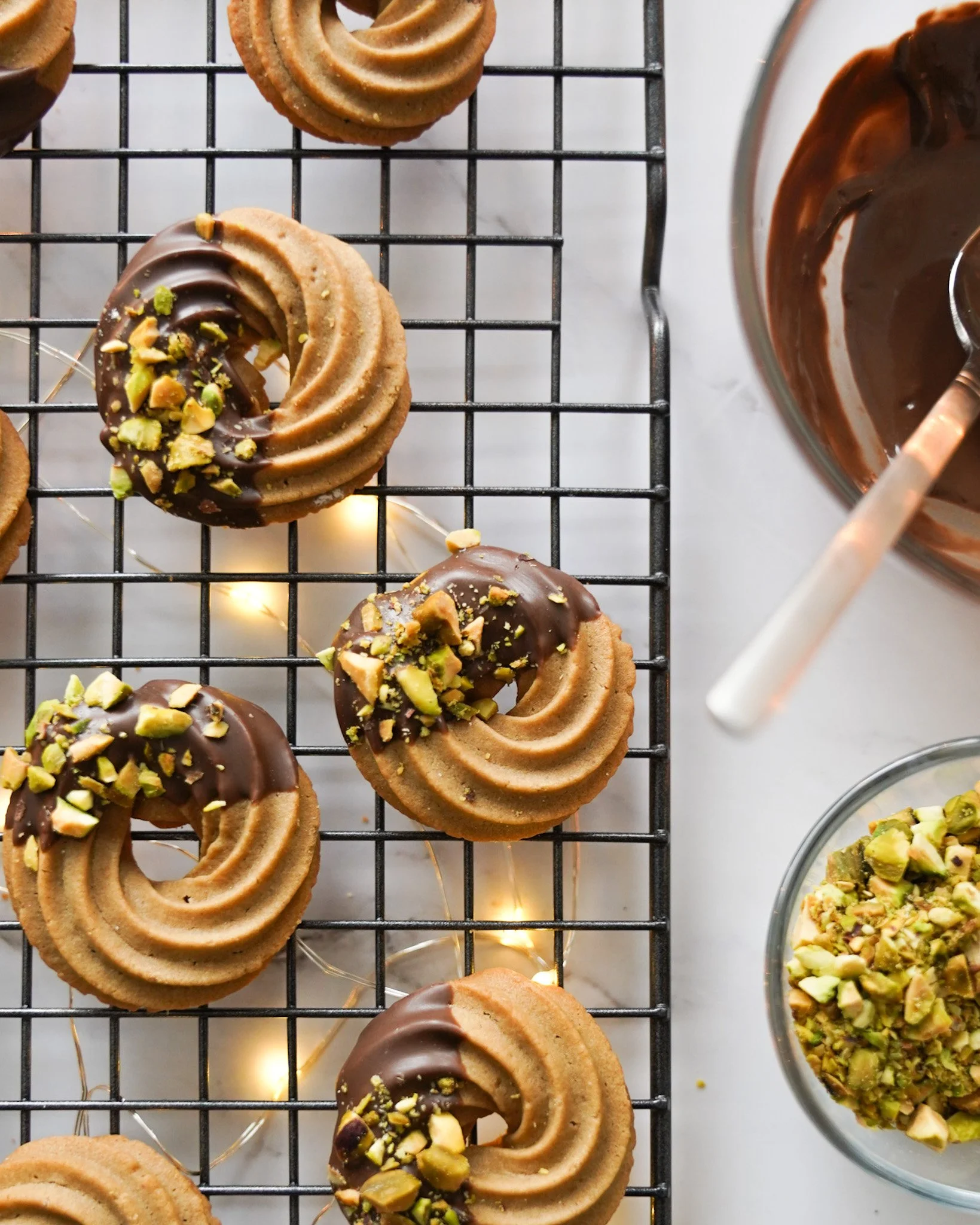 10. Allow the baked cookies to cool before dipping them in melted dark chocolate and sprinkling on chopped pistachios.