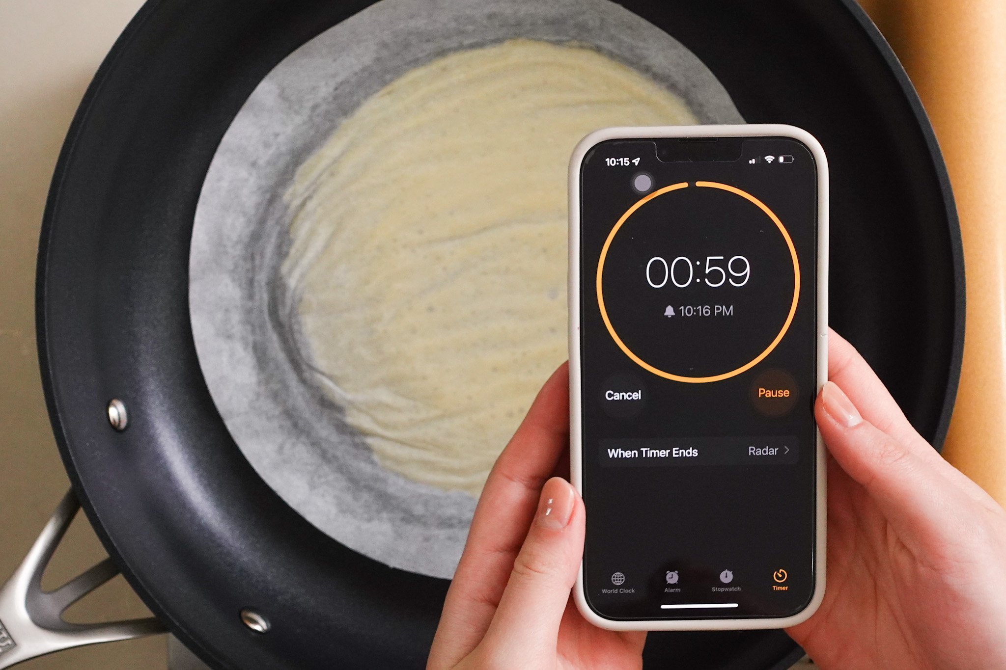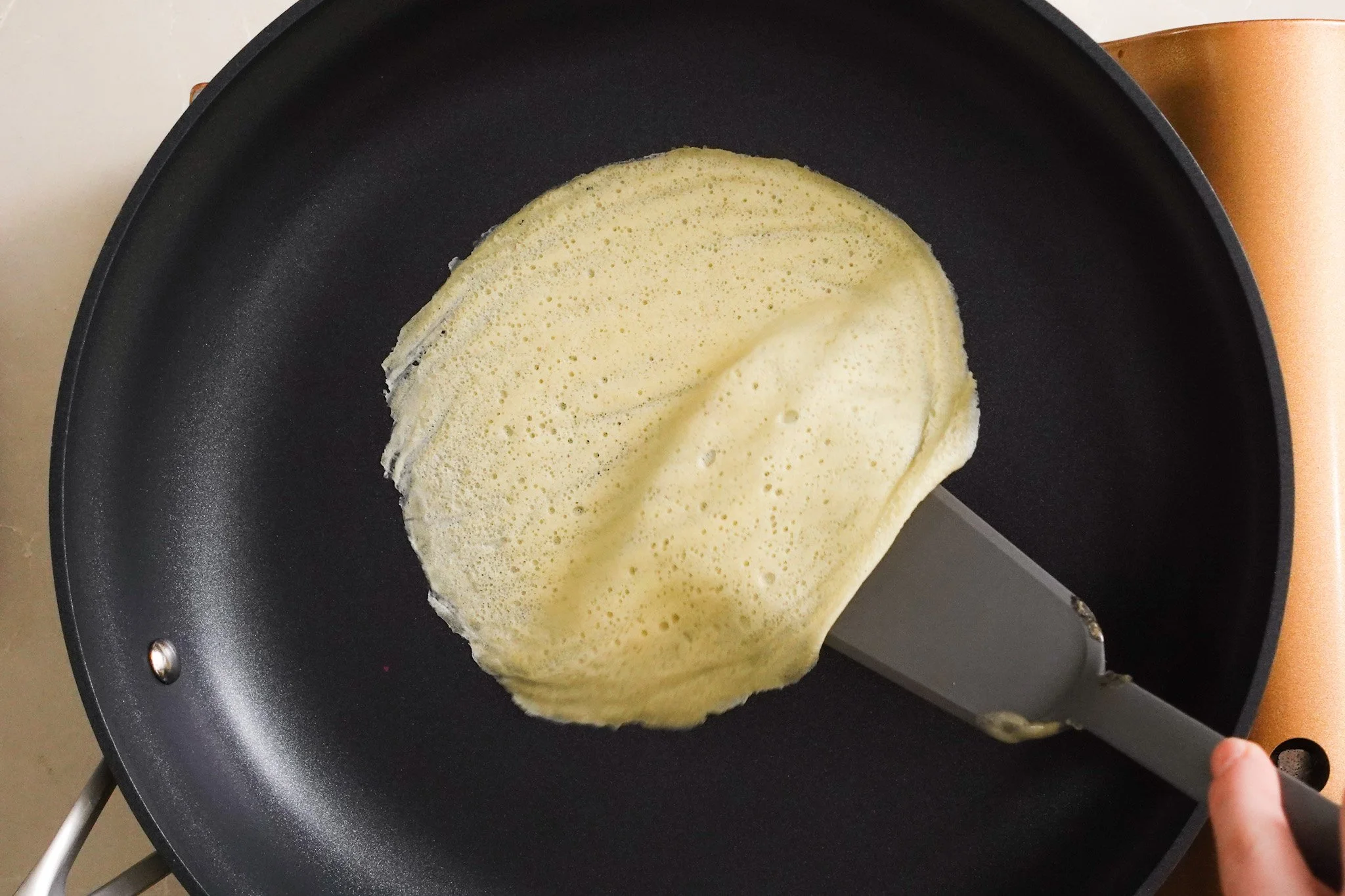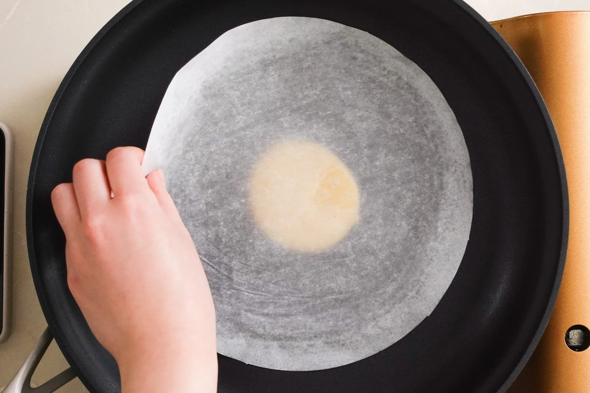 9. To imitate the effect of a crepe press, immediately lay on a sheet of parchment paper, followed by the bottom of a cake pan, and press it down to create the thinnest layer of batter possible.