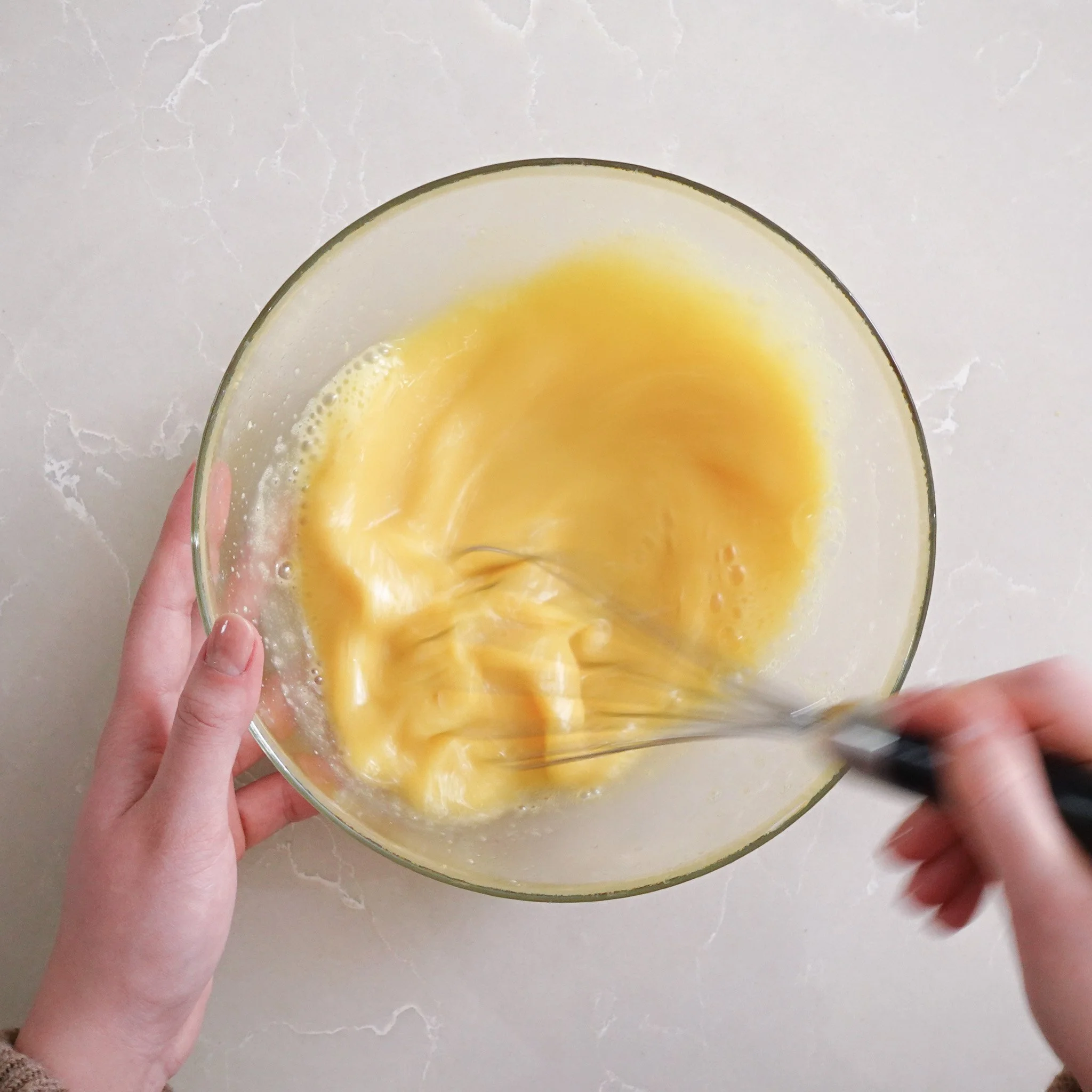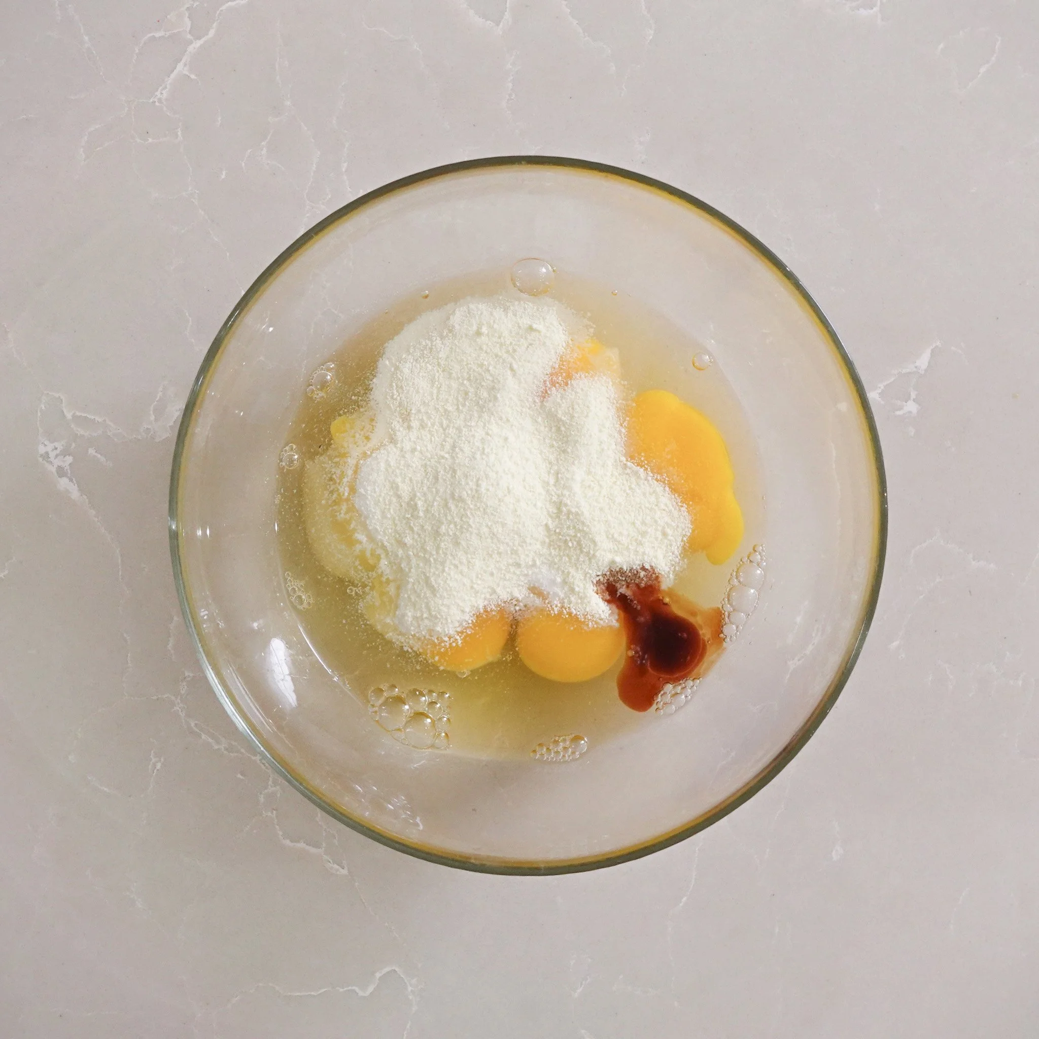 2. In a bowl, whisk together the eggs, sugar, milk powder, and vanilla until the sugar granules and milk powder have dissolved.