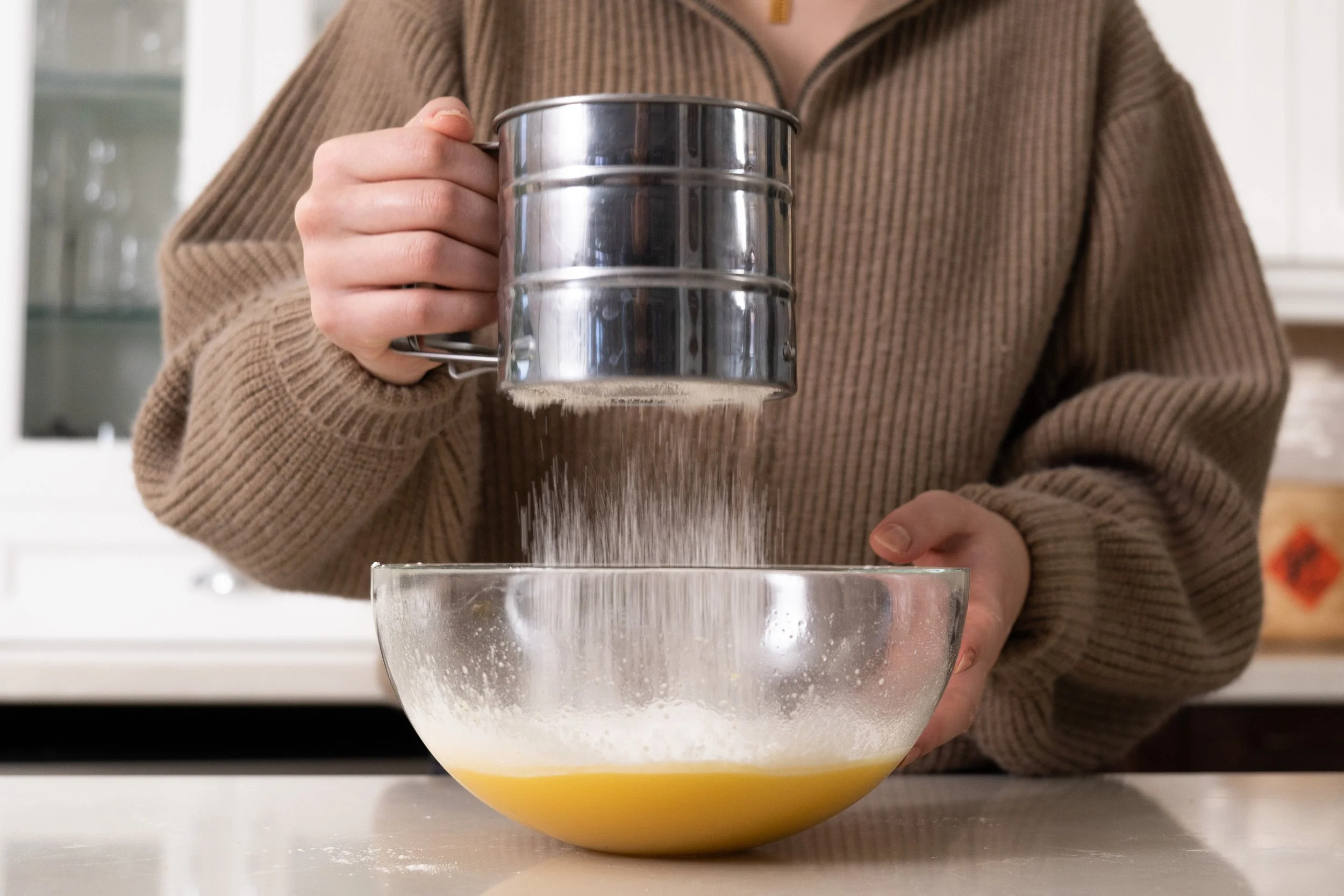 4. Sift the dry ingredients into the eggs and add the cooled butter. Mix until smooth.