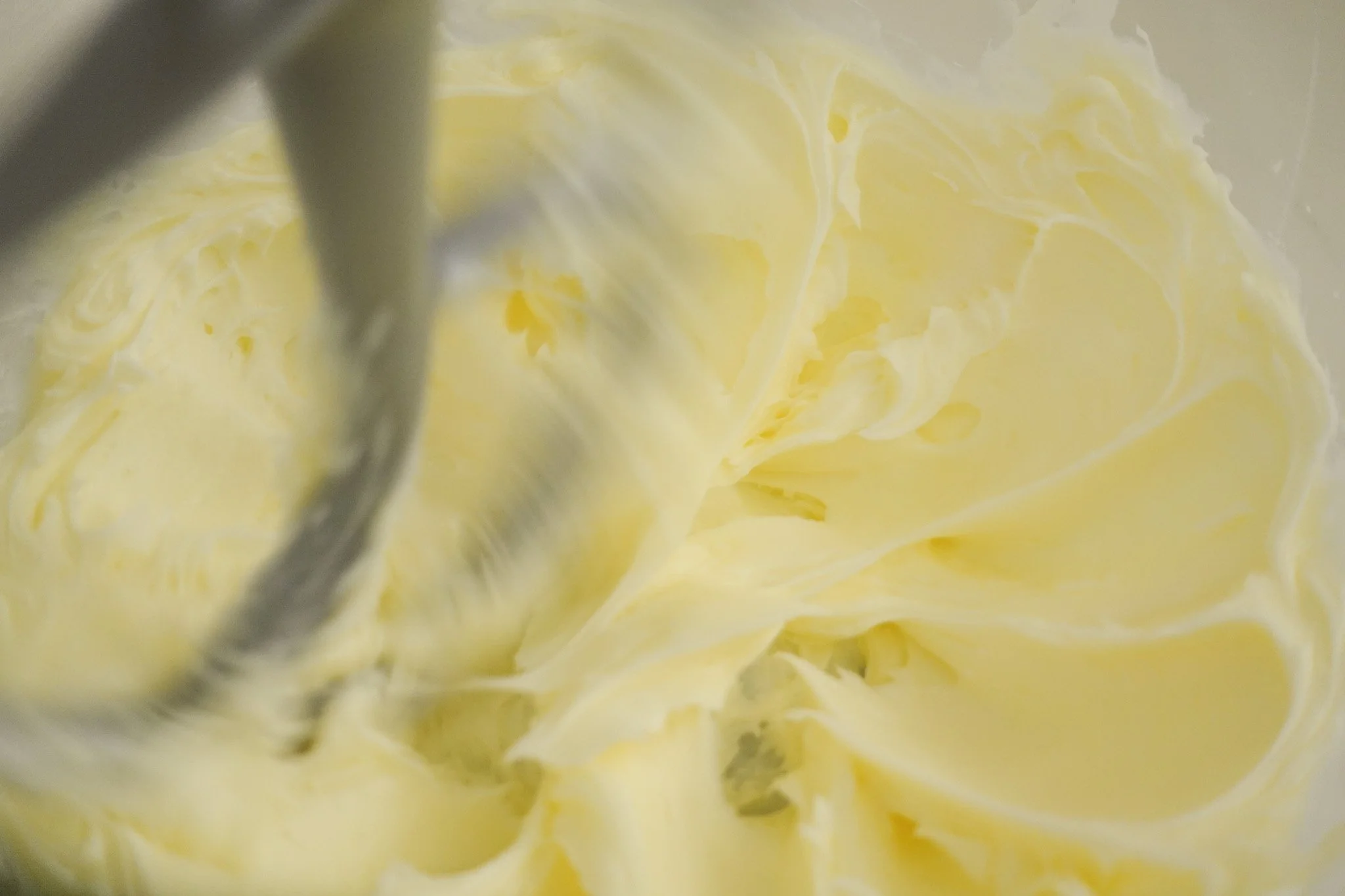 1. Beat the softened unsalted butter with the white granulated sugar until soft and creamy.