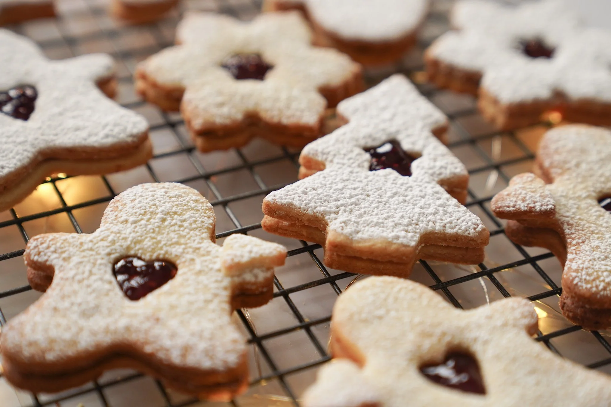 8. Once cooled, spread some raspberry jam onto one cookie and sandwich with another. For an optional step, you can dust the top of the cookie sandwich with icing sugar.